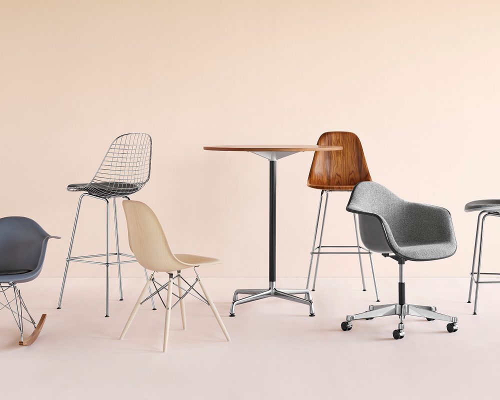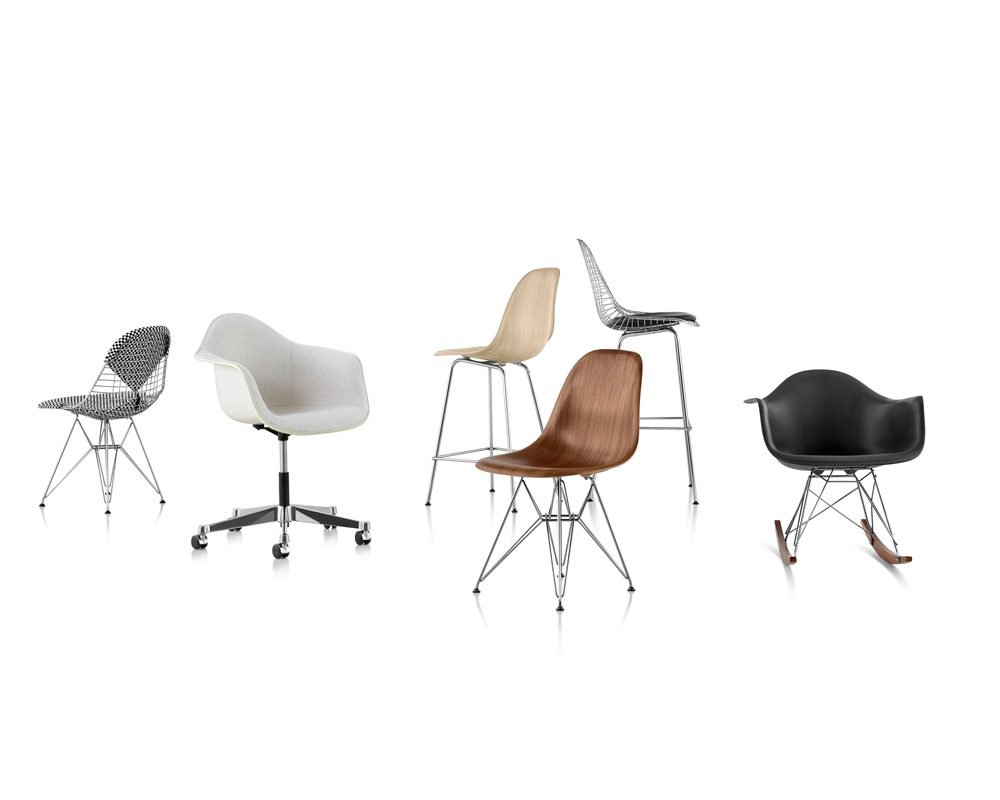 With the moulded plastic, fiberglass, and wood shell chairs—as well as the wire chair—the Eames have created a universal