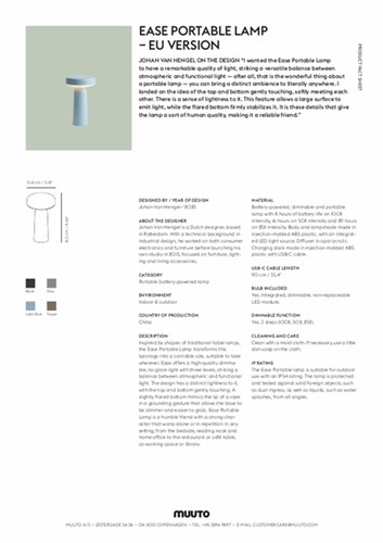 SPECIFICATIONS | IP Rating - The Ease Portable lamp is suitable for outdoor use with