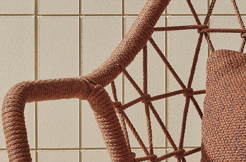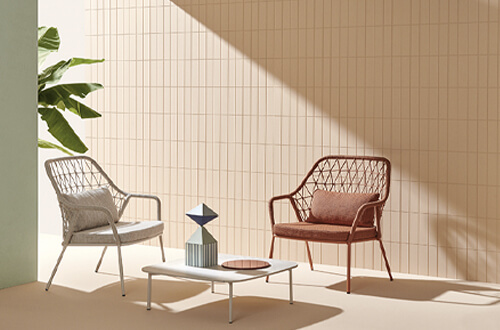A lounge armchair featuring a traditional element in polypropylene cord hand-woven in Italy that wraps around the Ø 20 mm steel tube frame.