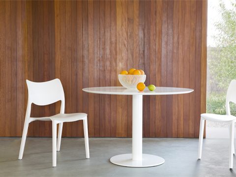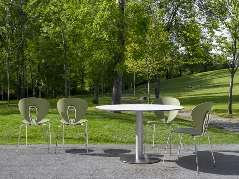 The top, round or square, can be produced in plywood, glass or HPL (High Pressure Laminate). HPL tops are valid for outdoor use.